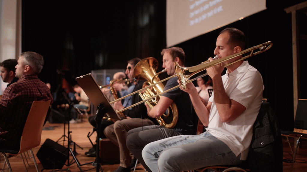 Sur scène, on trouve un ensemble musical varié : guitares, violons, batterie, piano et instruments à vent. Et dans la régie, Leona, 13 ans, veille à ce que les paroles des cantiques s’affichent correctement à l’écran, afin que tout le monde puisse chanter en chœur.