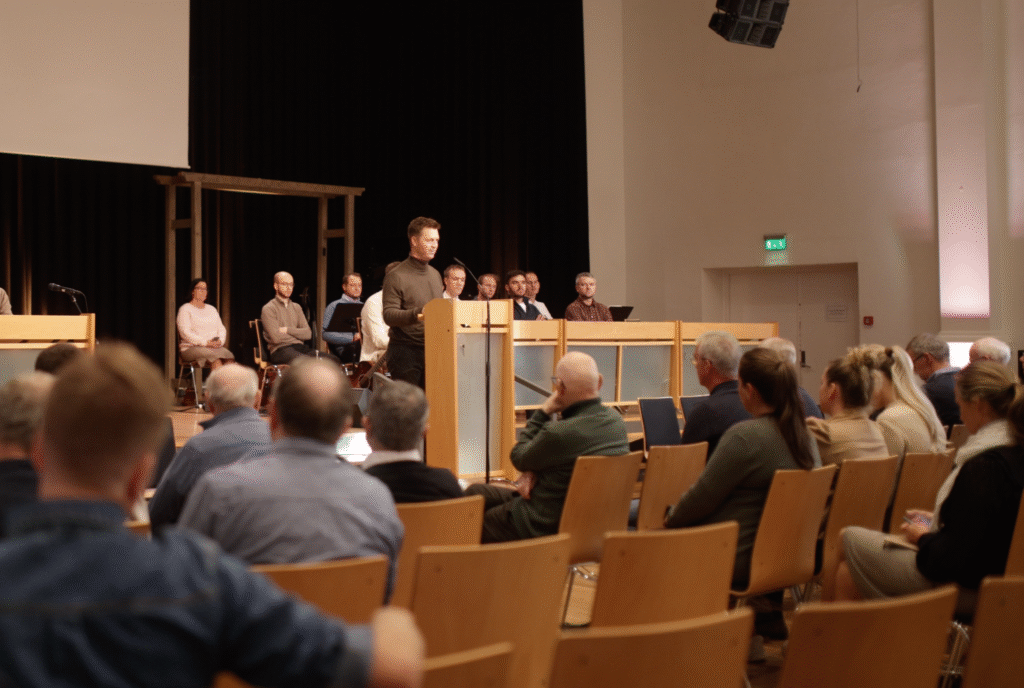 Le responsable de la réunion monte au pupitre et souhaite la bienvenue à la réunion dominicale, comme on appelle les offices religieux. C’est généralement le responsable spirituel Trond Eriksen qui dirige les réunions à Eiker, mais lorsqu’il est absent, plusieurs autres personnes peuvent le remplacer. Aujourd’hui, c’est Tore (41 ans) qui souhaite la bienvenue.