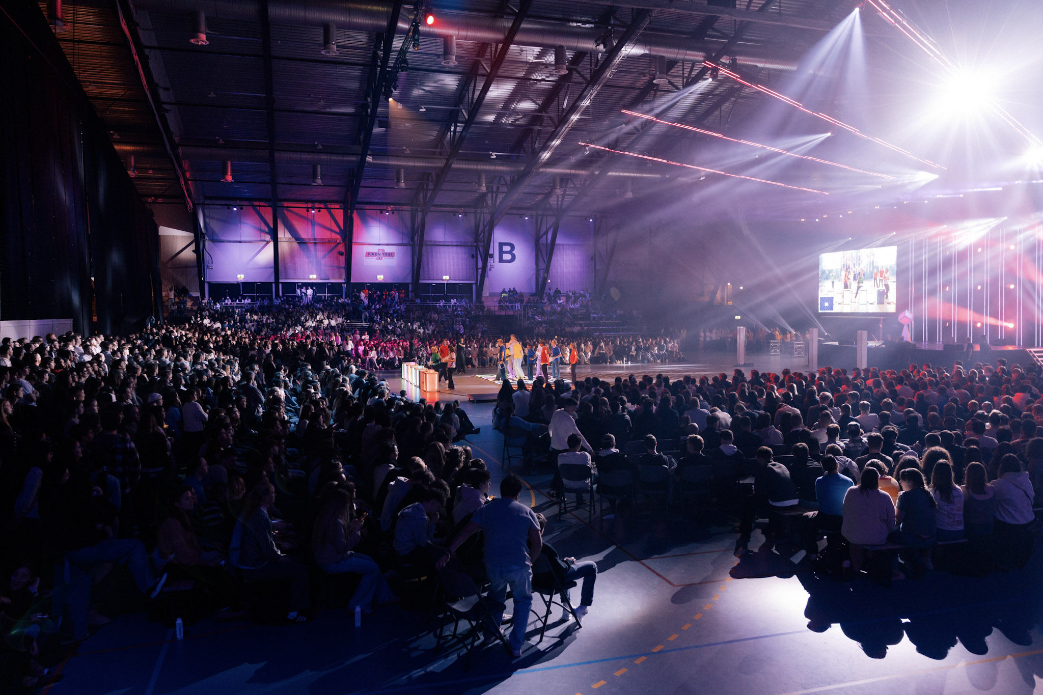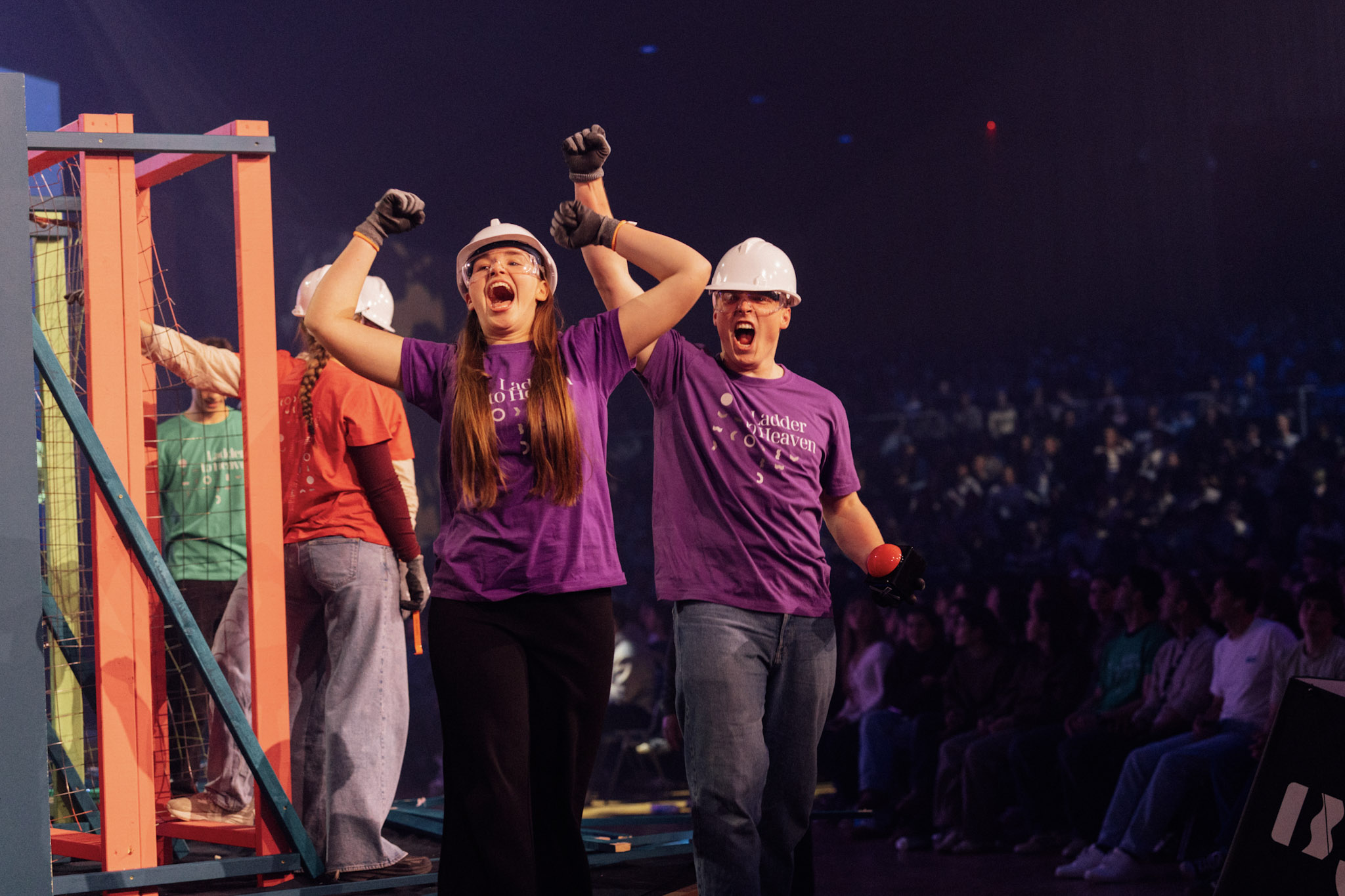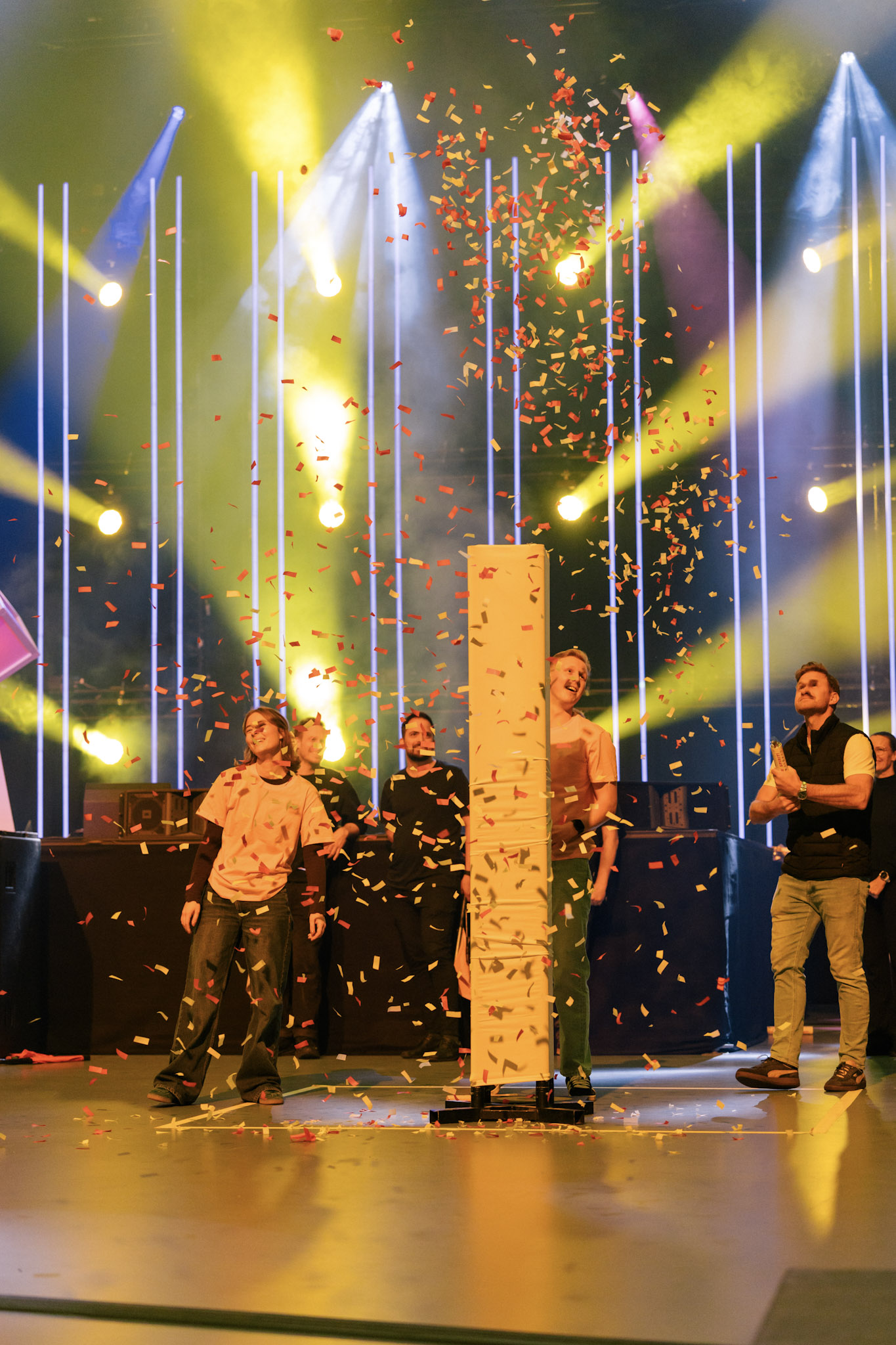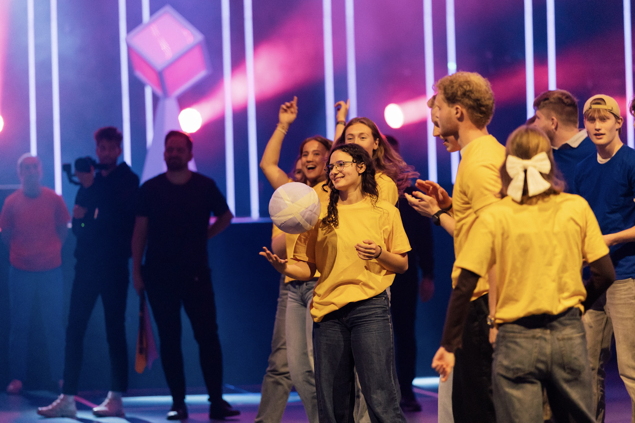 Jubelrop blant de sveitsiske deltakerne fra lilla lag som vant konkurransen under Game Night.